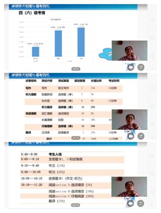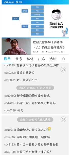 在最后的四级考试相关疑问解答环节。同学们积极地进行“弹幕”互动,各抒己见。无论是对英语考试知识应对方法,还是自身心态问题,程老师都耐心解答。