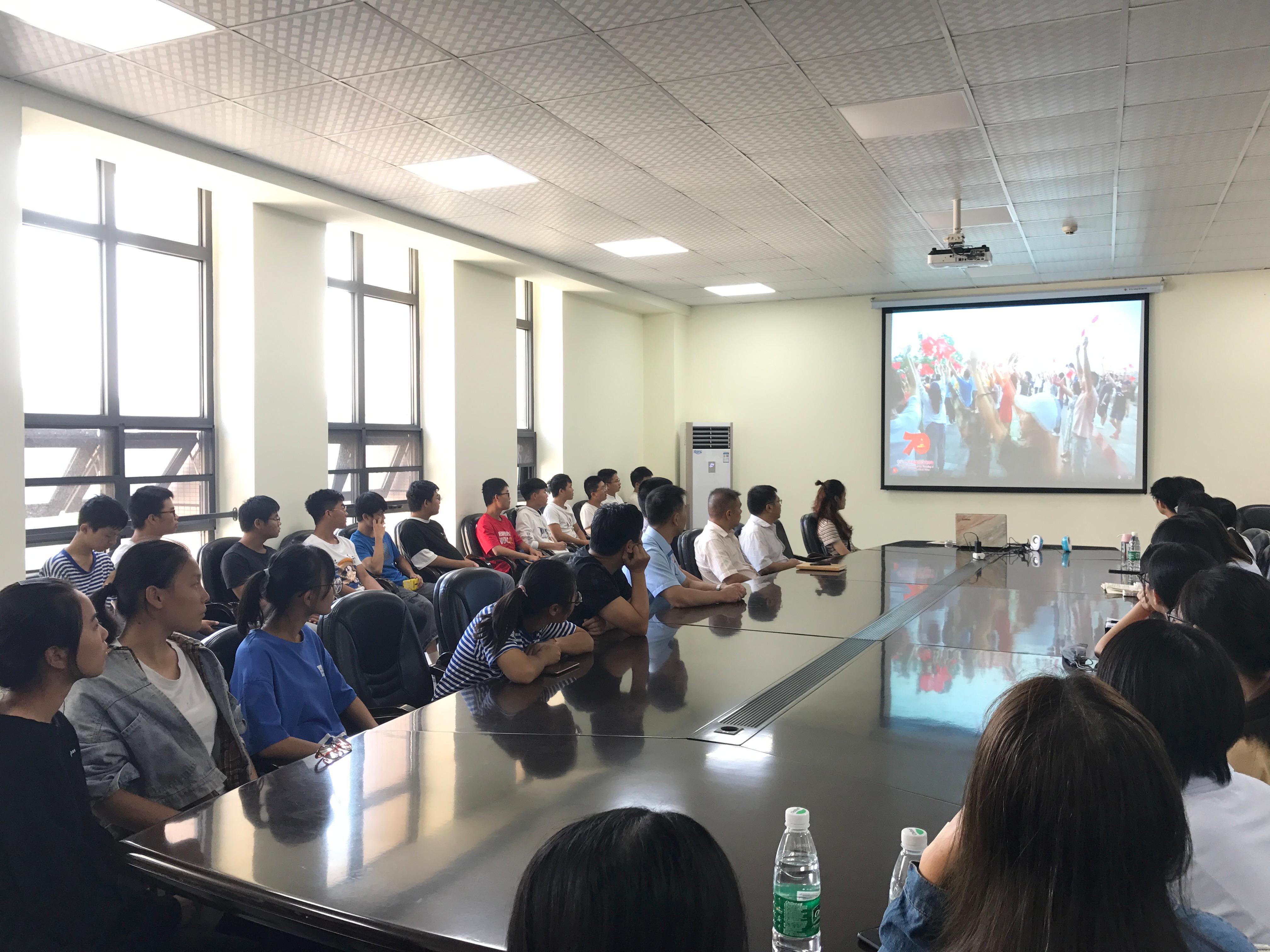 随后在上午9时,公司领导、辅导员和19级员工、入党积极分子、员工党员们在公司3002会议室整齐就坐等待着观看国庆阅兵盛典。此次仪式是给青年员工最大最好的一堂爱国课,也是进行爱国主义教育的“最生动教材”。 56门礼炮齐响,战斗机在天空摆出70的字样,庆祝新中国七十华诞,老将不老,众志成城勠力同心。党员项明达同学说:“长空猎猎,铁骨铮铮。当阳光打在鲜艳的巨幅国旗上的时候,当坚实而响亮的步伐震动大地的时候,当一件件大国重器在广场前巍然驶过的时候,我都会从心底涌起家国天下的壮志豪情,我都会真诚地祈盼国家昌盛富强。”