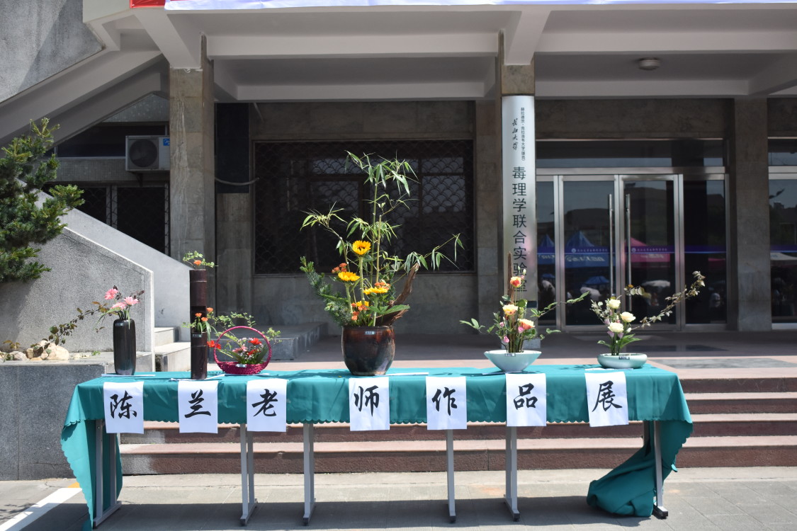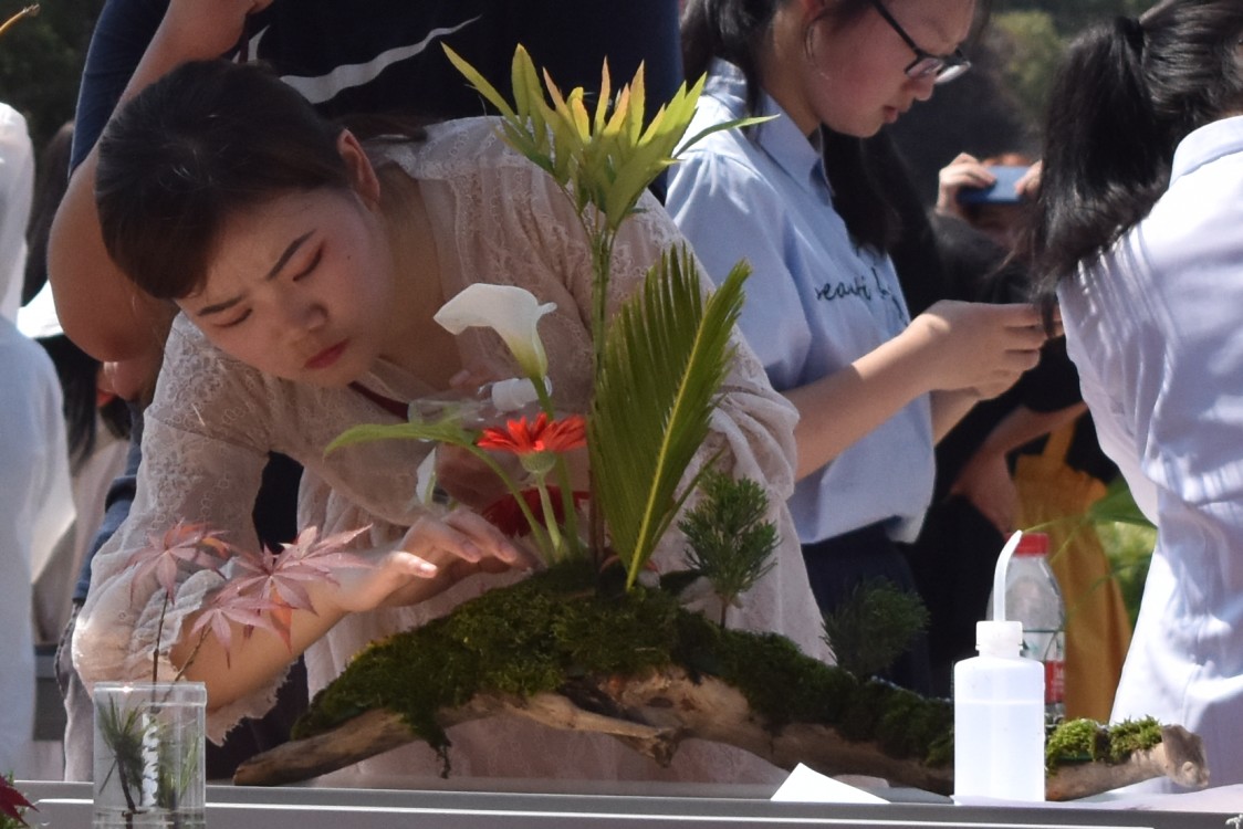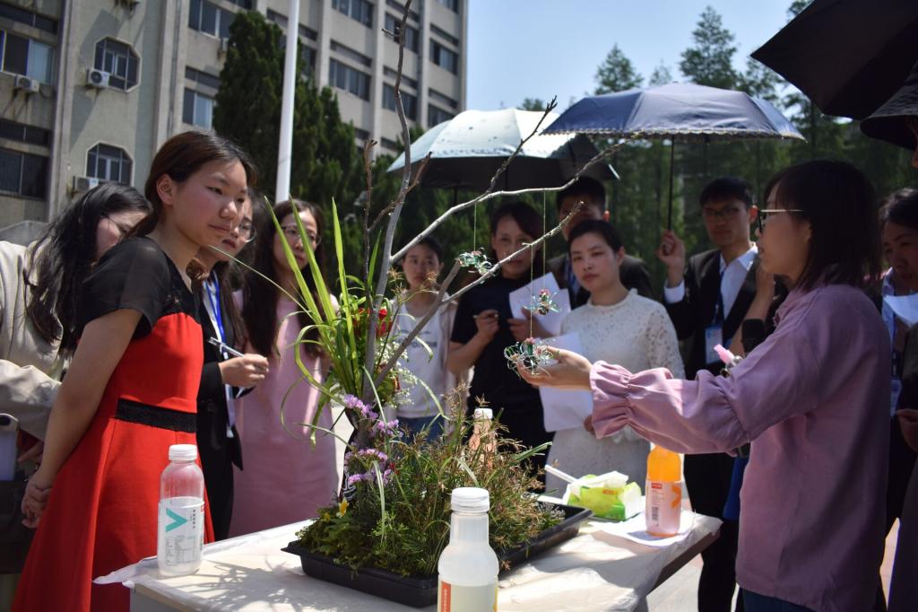 除主赛场外,现场还有叶脉书签制作、绿植专区、茶艺表演、吃水果大赛、景观创意作品展五个子活动以及陈兰老师花艺作品展。其中,陈兰老师作品展吸引了许多同学观赏。她的作品采用插花六大容器:盘、碗、缸、篮、桶、瓶做载体,她向同学们介绍其作品的创作灵感及寓意:“绿竹正气,水出芙蓉亭亭玉立,李枝延长犹如春去花还在,插花和诗韵有着异曲同工之妙。”陈兰感慨道:“提及东方插花人们只会想到日本,其实它源自中国,作为中国插花协会的讲师,我一直希望有更多国人喜欢插花,弘扬传统文化,坚持文化自信。今天看到现场这么多爱花的人,我很欣慰也很高兴。”