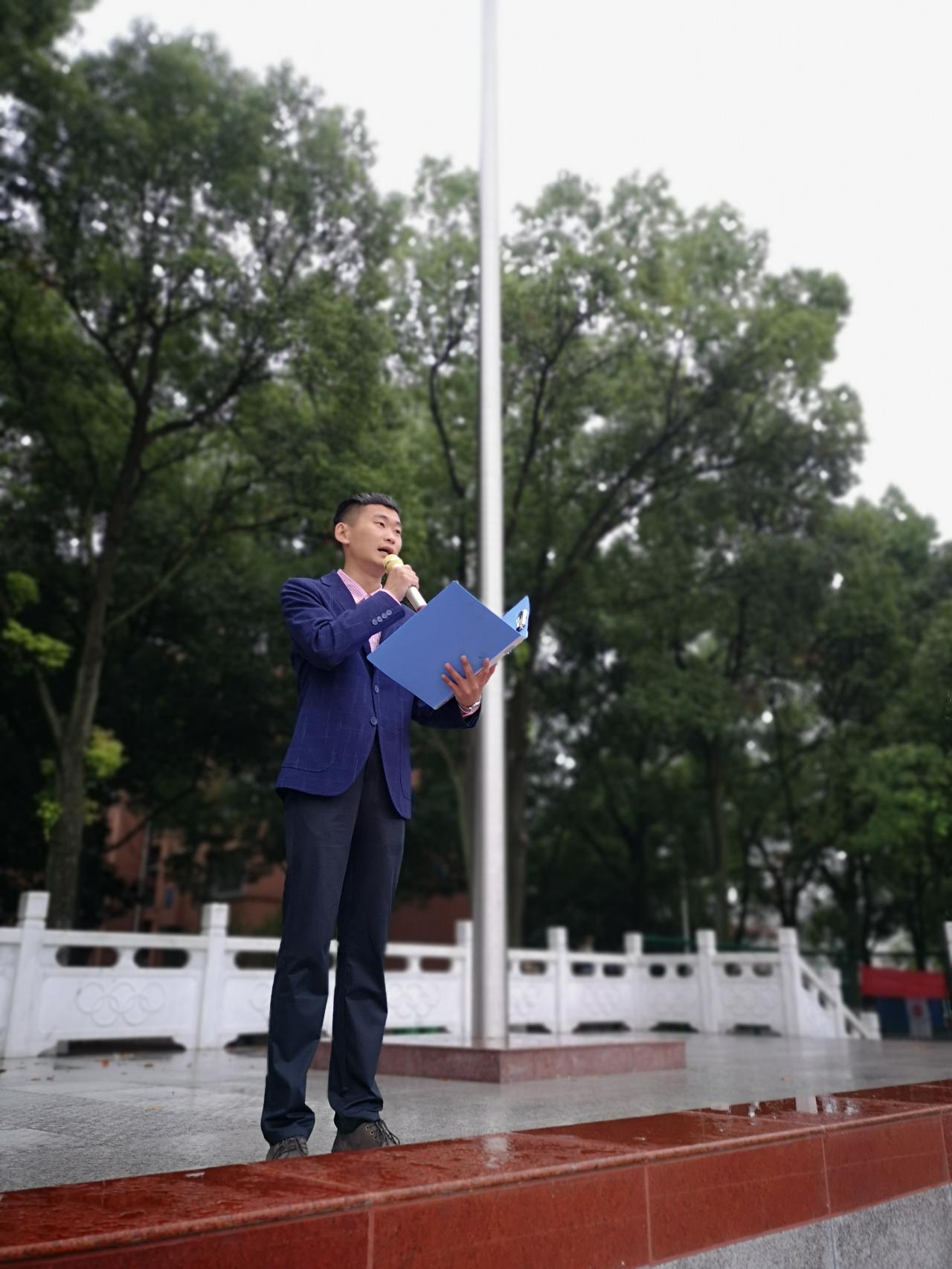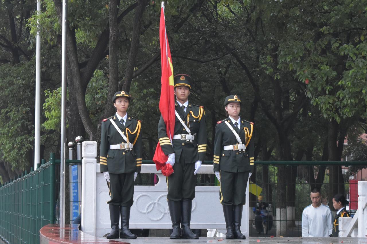 七点整,全体与会人员准备就绪。国旗护卫队迈着铿锵有力的步伐,庄严的护送着五星红旗走向升旗台,台下全场肃穆。在激昂的《义勇军进行曲》中,升旗手振臂一挥,鲜艳的五星红旗冉冉升起。在蒙蒙细雨中,全体师生向国旗行注目礼,深怀对祖国无限的热爱和崇高的敬意。