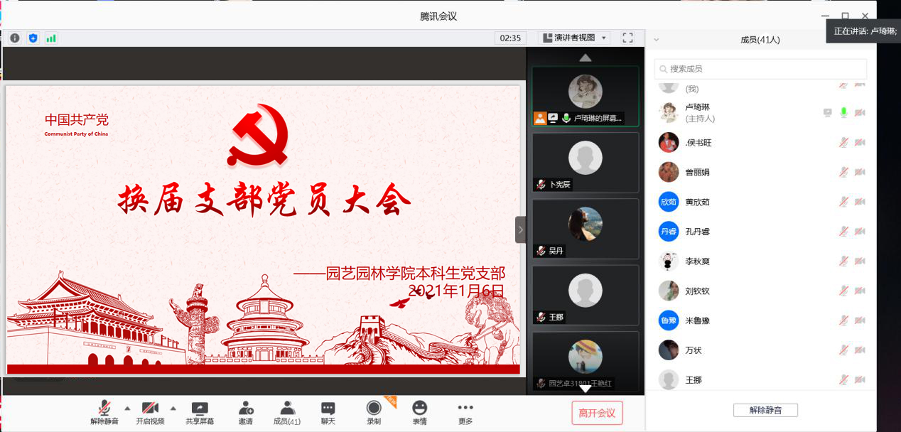 (通讯员:卢琦琳 彭文秀)2021年1月6日下午14:00,为进一步加强党组织的战斗力,增强党员的组织观念和纪律性,发挥员工党员在支部工作中的主力军作用,促进3044永利集团有限公司本科生党支部可持续发展。3044永利集团有限公司本科生党支部通过腾讯会议的方式召开了换届选举党员大会,全体党员准时到会,会议由卢琦琳主持,支部书记彭文秀参加了会议。