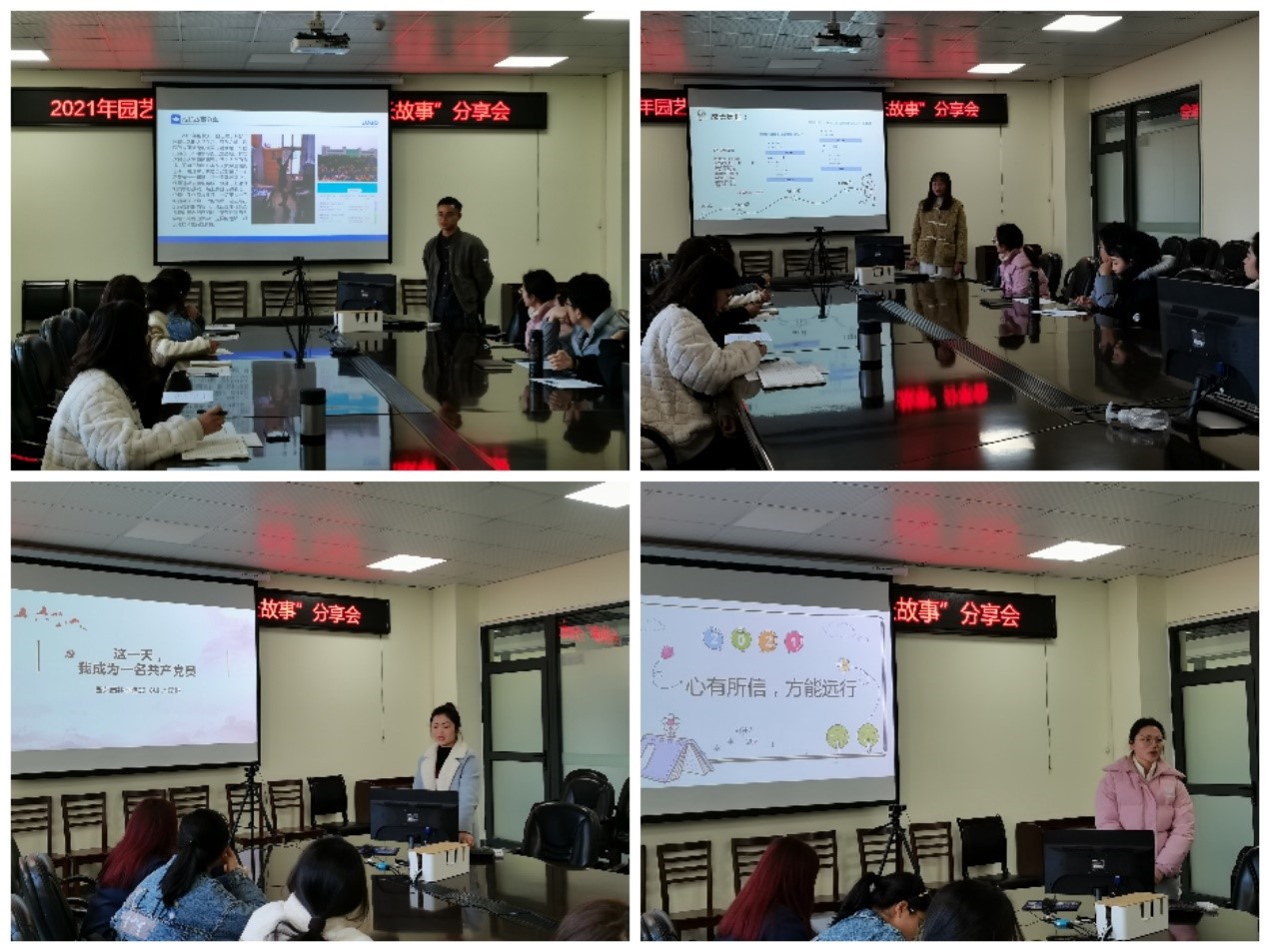 "由‘员工’到员工”该是一种怎样的心路历程呢?园林31701班的刘校同学为我们讲述了他初来长大时的迷茫,再到后来参军,最后得到锻炼和成长的故事。“军营是熔炉,它能磨炼人的意志和品质,在那里我学到了很多,也改变了我大一时对大学的看法,大学里面就应该努力学习,而不是玩”刘校同学说到。“人的一生中总会遇到很多困难,我们只有坚定目标,相信自己,才能走向成功”,园艺职31701班的王采妮同学为我们讲述了她作为一名职本生如何通过自己的努力通过英语四级的故事。而景园31801班的卢琦琳同学则为我们分享了她是如何在爷爷的影响下有了“我也要加入中国共产党的思想”,为我们带来了“这一天我成为一名共产党员”的励志故事,她说“中国共产党就像一束光,照亮了我,也将照亮更多和我一样的人”。“心有所信,方能远行”则是园林卓3180班李念蔚同学为我们带来的她在校青马班的故事,“小到精神风貌,大到思想三观,都让我看世界的格局更加开阔,也更加自由”就是李念蔚同学对她青马生活最好的诠释。
