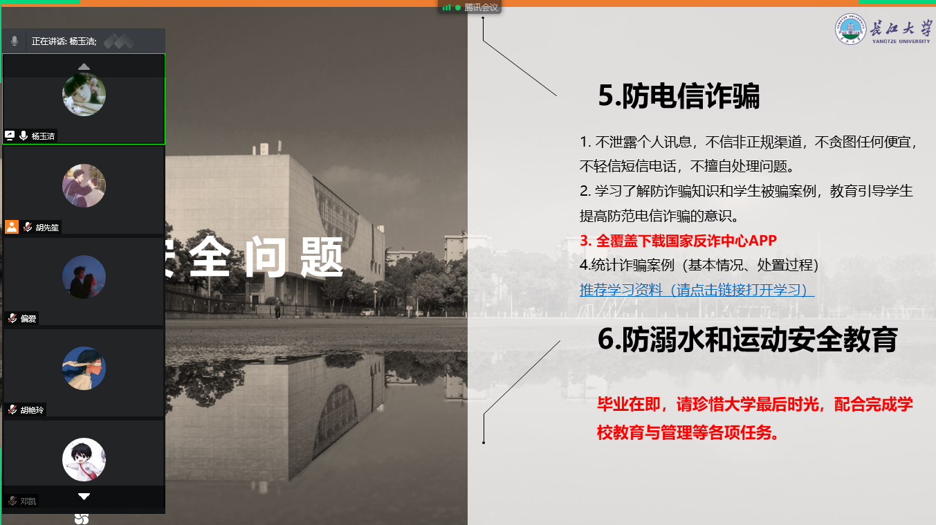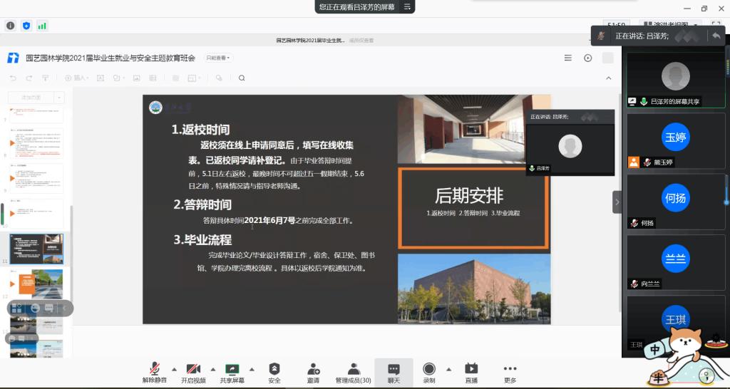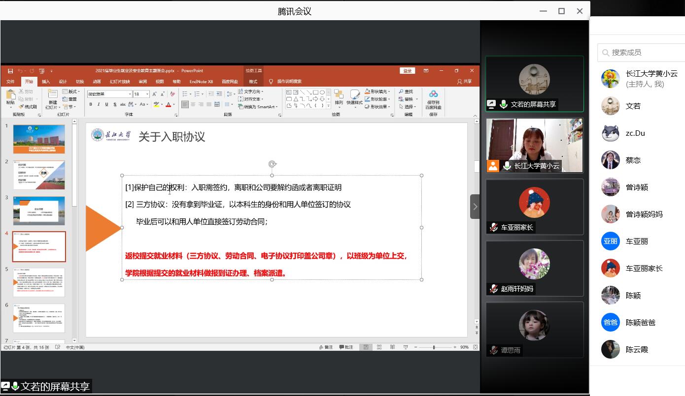 2021届毕业生主题班会由班主任组织召开,通过在线腾讯会议的方式进行。会议主分两部分。一方面是从毕业生息息相关的就业问题展开,从当前的就业情况,毕业生即将面对的就业签约、报到证办理、档案派遣等方面展开详细阐述。一是从当前的就业及考研形式,引导同学们树立“先就业、再择业”的正确择业观;二是提醒毕业生员工要保护自己的权利,入职需签约,离职需要向公司索要解约函;同时注意实习期、见习期等方面的区别;三是对报到证、个人档案做了介绍,提醒同学们需要妥善保管好报到证、档案;四是介绍了团、党组织关系的转接,解答了毕业后毕业生组织关系何去何从的问题。