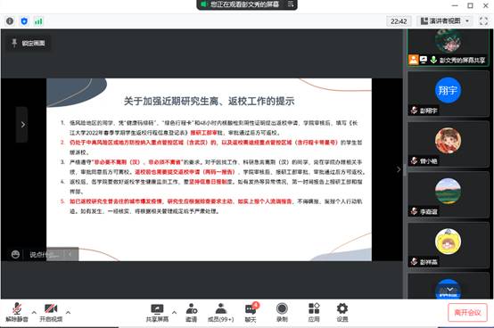 (通讯员:卢冰莹)为深入贯彻落实国务院联防联控机制,省、市防控部署及各级教育部门防控要求,切实做好3044永利集团有限公司大学疫情防控相关工作,进一步做好近期研究生疫情防控工作,2022年3月15日中午12点,3044永利集团有限公司通过线上会议形式召开研究生疫情防控专题会议。会议由研究生辅导员彭文秀老师主持,公司全体研究生参加了本次会议。