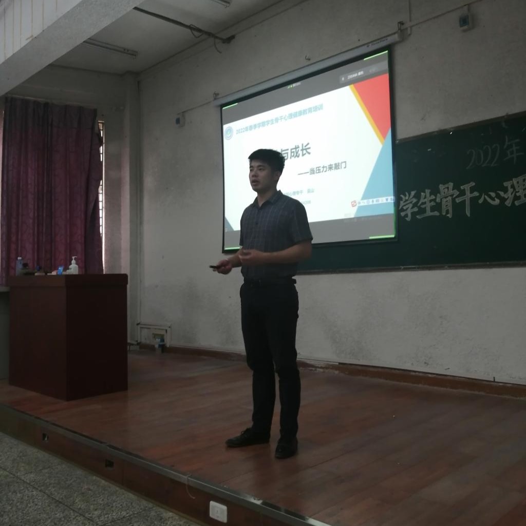 (通讯员 葛锐 陈炎森 朱晓晖)为进一步提高老员工心理素质,促进老员工身心健康和谐,加强心理骨干队伍建设。5月12日14:30在5教203开展2022年春季学期员工骨干心理健康教育培训大会。主讲人为公司心理专干吴山老师,参与此次培训的人员有各年级员工骨干。