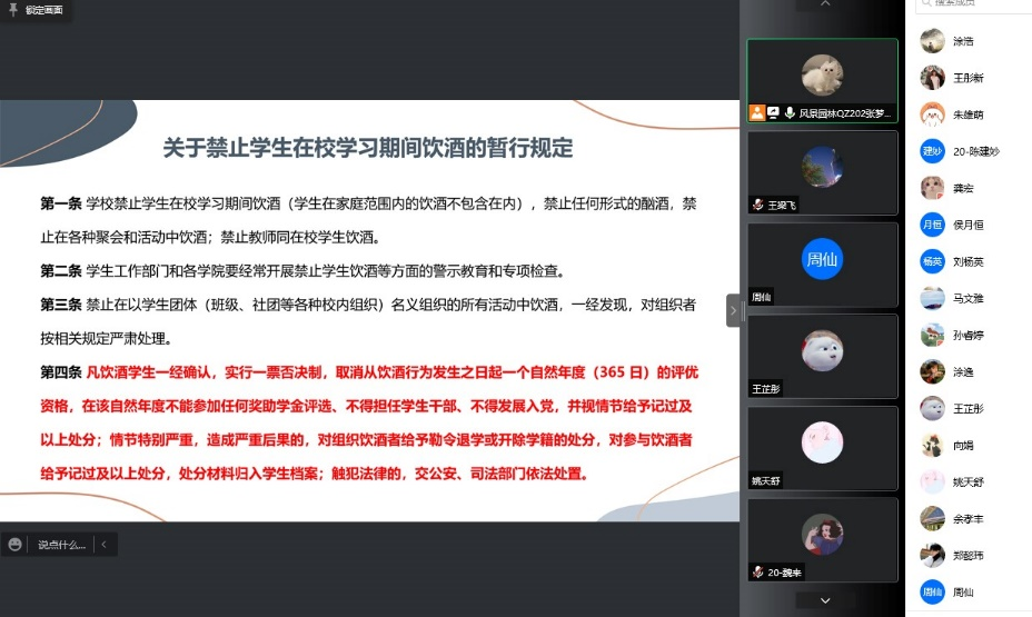 公司要求员工认真办理离校、返校手续,希望每一位同学能够严格履行请假离校、返校申请手续;防溺水教育环节通过溺水案例引入,带领大家学习防溺水安全常识,重点强调严禁私自外出,杜绝近水活动;毕业季来临,班会特别对同学们强调《3044永利集团有限公司关于禁止员工在校学习期间饮酒的暂行规定》,严禁组织任何形式的聚餐活动;此外,宣讲防诈骗知识和员工被骗案例,引导同学们提高防范电信诈骗意识。