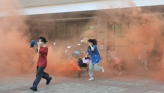 活动开始,荆州区消防支队的副队长向老师同学们讲解了校园突发事件的部分案例,并对“如何学会预防火灾”、“如何在火场自救逃生”等消防安全知识进行教育,就这类突发事件的逃生方法进行了详细的讲解。随后逃生演练正式开始,教学楼浓烟冒出,立即启动应急预案,开展灭火、突发事件紧急疏散工作。火灾警报发出,全体员工在现场老师的引导下,用湿毛巾或手捂住口鼻,弯腰跑步前行,按照事先制定的疏散路线,同学们分别从教学楼楼梯迅速有序撤离到室外安全地带。演练最后消防支队副队长对演练情况进行了总结,对应急演练中做得规范标准的同学进行了表扬,对逃生中需要重点注意的问题进行了再次提醒。