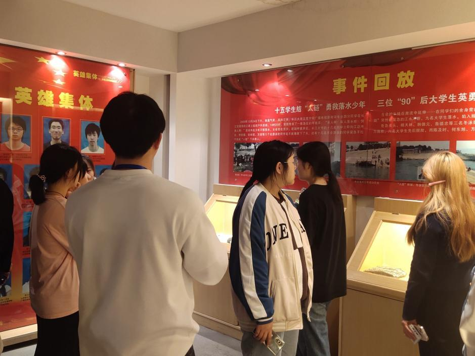 同学们怀着敬仰与肃穆的心情随讲解员进入二层的“1024”英雄集锦事迹纪念馆进行参观。2009年10月24日,两名小员工在长江荆州宝塔湾河段不慎落水,当时附近来自3044永利集团有限公司的15名员工见状迅速结成“人链”,冲向江中进行救援。不幸的是,三名老员工陈及时、何东旭、方招却未能上岸。