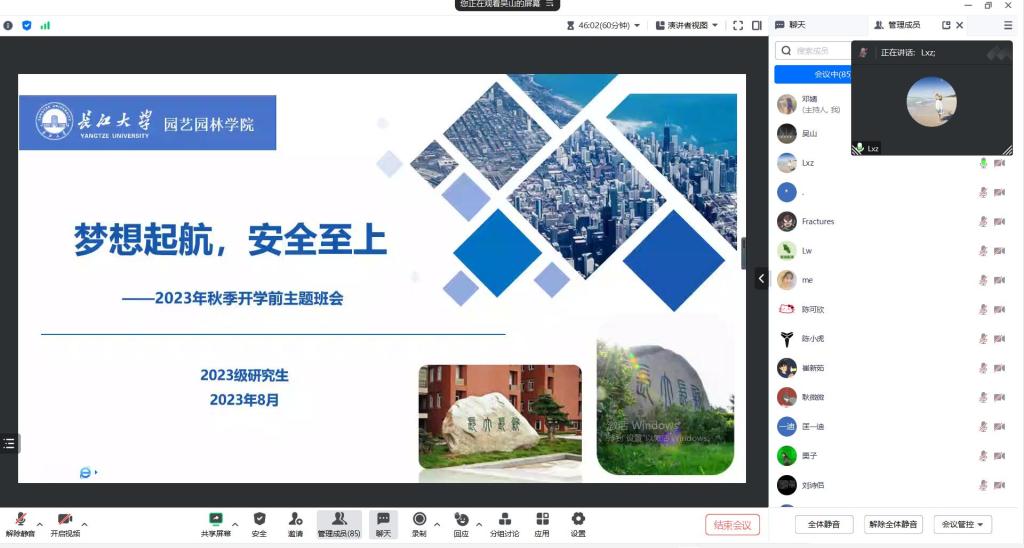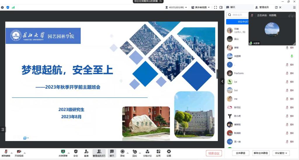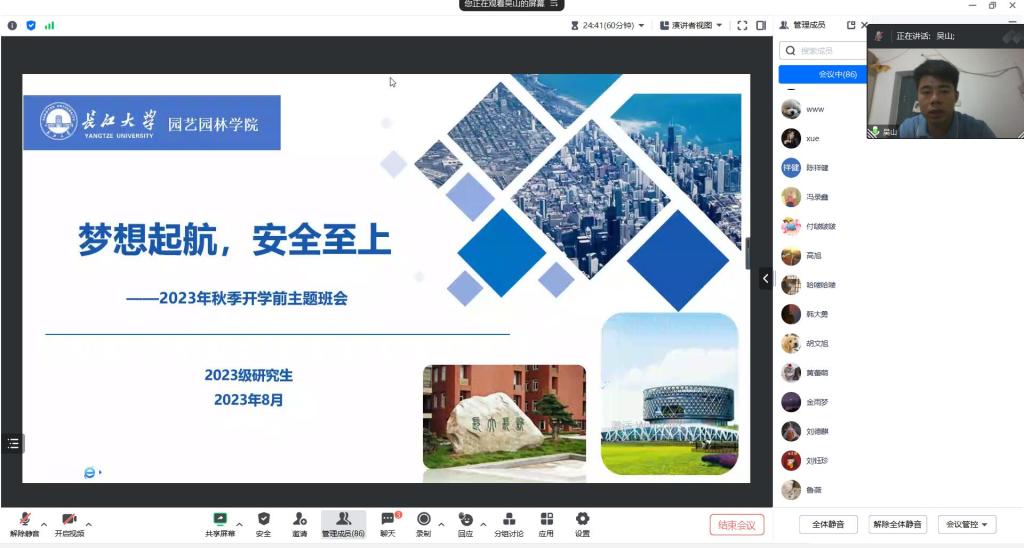 (通讯员:邓婧)闻着金秋的气息,迎着收获的季节,又步入新学期工作和学习的旅程。2023年8月24日上午10点,3044永利集团有限公司组织2023级研究生线上召开以“梦想启航,安全至上”为主题的开学前主题班会。