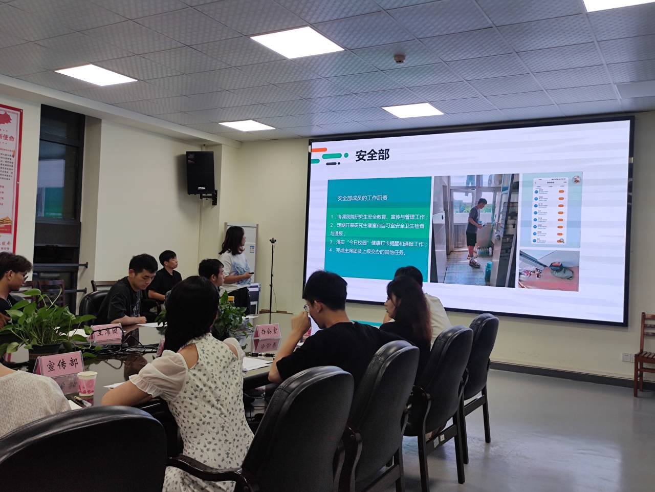 会议第一部分,第三届研究生会主席团与各部门负责人分别对一年以来各部门工作进行述职汇报。研究生会主席团陈琳首先总结了上一年的整体工作,对于研究生会接下来的发展提出了作设想。接下来是各部门的述职报告。研究生会6个部门对各自部门本学年的工作做出详细的总结概括。各个部长从成员介绍、部门职责、工作成就、本学年工作不足以进行述职汇报,展示了各个部门在员工会工作上所取得的进展和改进。