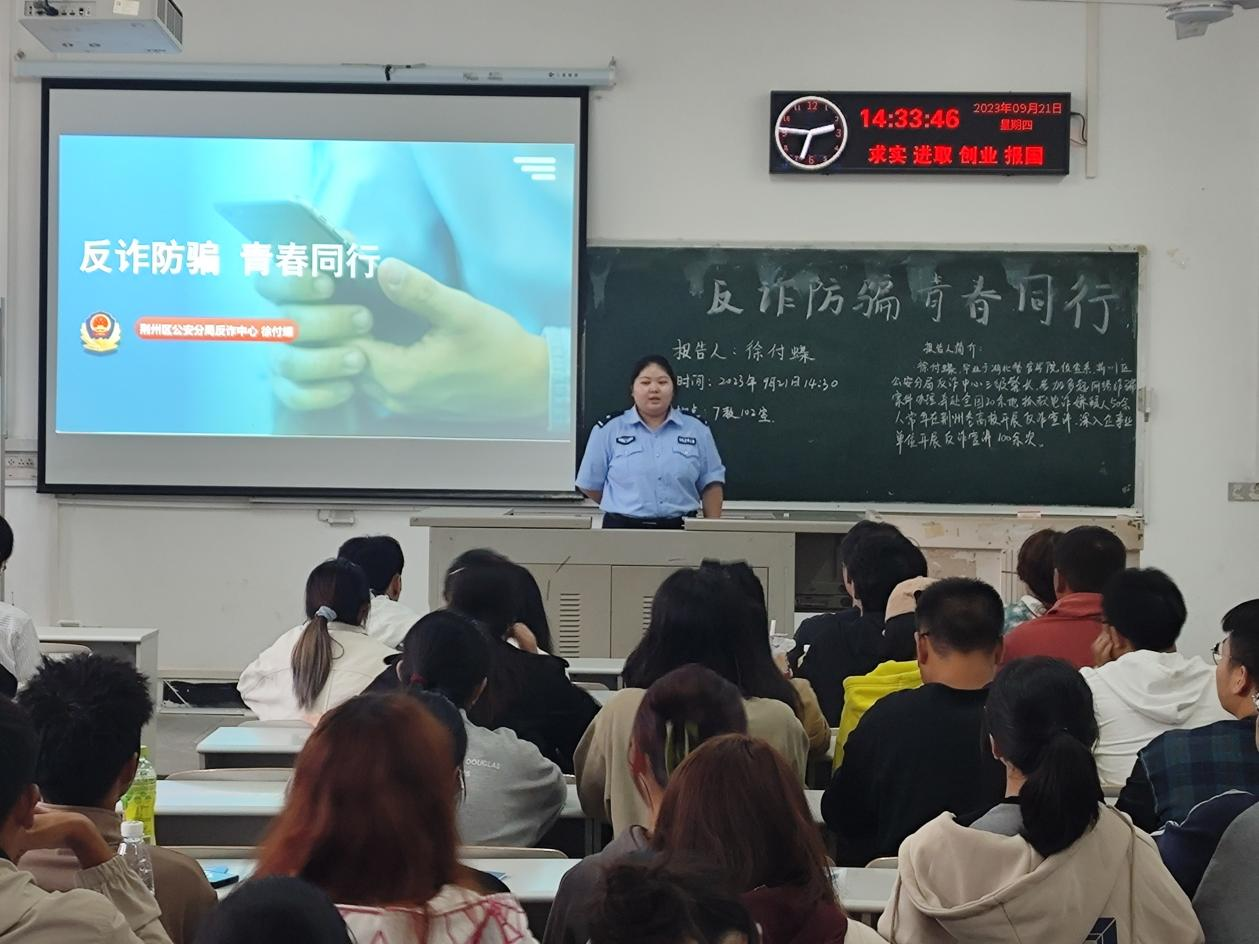 (通讯员:代熙本)为进一步增强员工防范电信网络诈骗的安全意识,有效遏制电信网络诈骗犯罪的发生,增强公司学子自我信息财产保护能力。9月21日,公司于西校区7教102教室开展“反诈防骗,青春同行”反诈骗宣讲。本次主讲人是荆州区公安分局反诈中心三级警长徐付蝶。