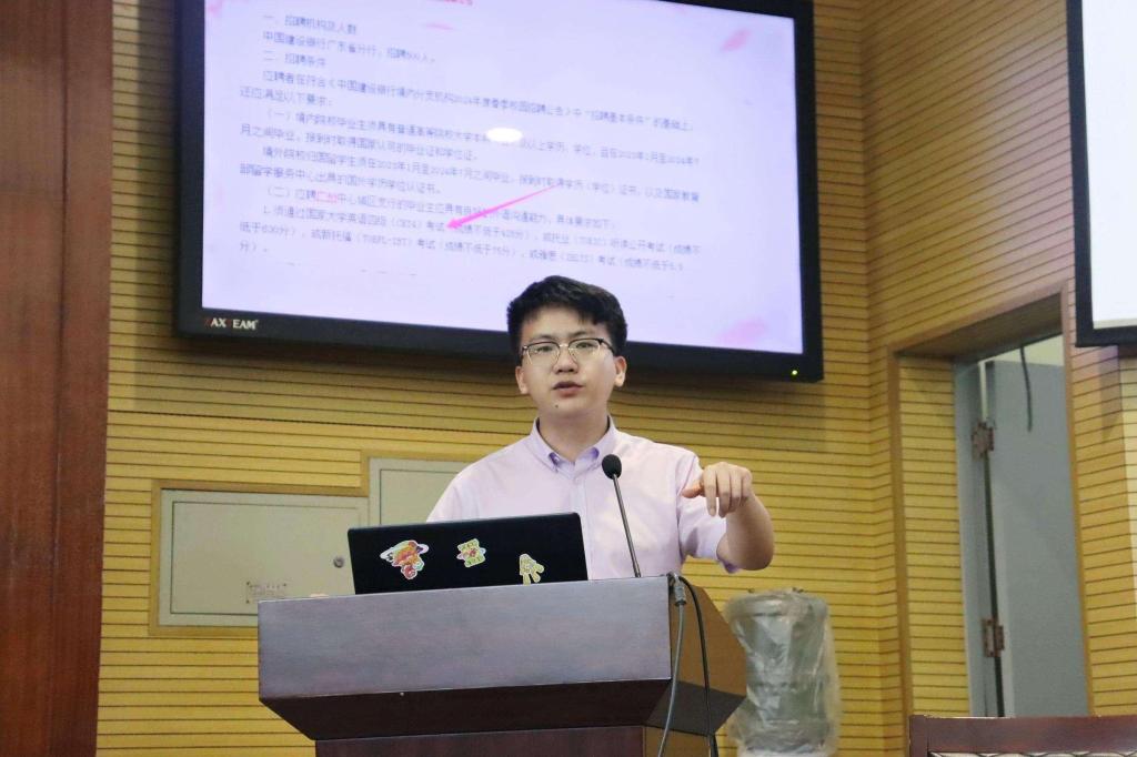 随后,张颖旭对近期早晚自习和公司工作做出解读,并列举部分高校的考研复试公告和企事业单位的招聘公告中涉及外语等级要求的部分,让同学们从考研复试、企事业单位招聘等方面切实了解英语四六级考试的重要性。他呼吁同学们一定要把握最后的一个月,积极备考四六级。