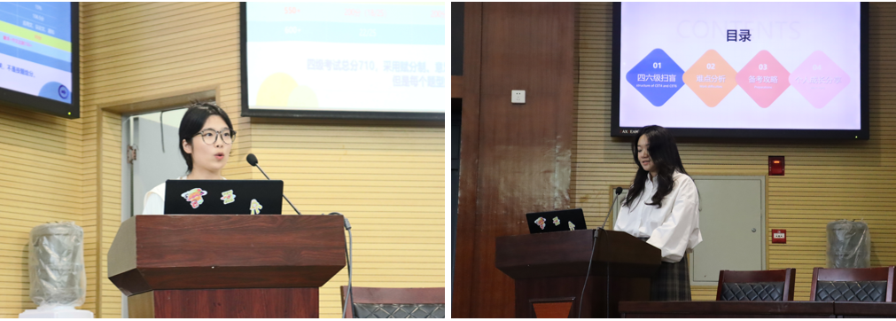 活动伊始,景园32101班徐菁结合自身备考经验,从高频词汇、听力练习等方面向同学们分享学习方法,紧接着她结合自身学干经历分享组织各类员工活动的心得体会;随后,园林职32001班岳雅诗针对英语四六级考试中翻译和写作两个模块内容做着重讲解,她结合自身考试经历,分享考试技巧。最后,她展示了园林职32001班过级情况,鼓励所有职本班级同学坚定信心,积极应考。