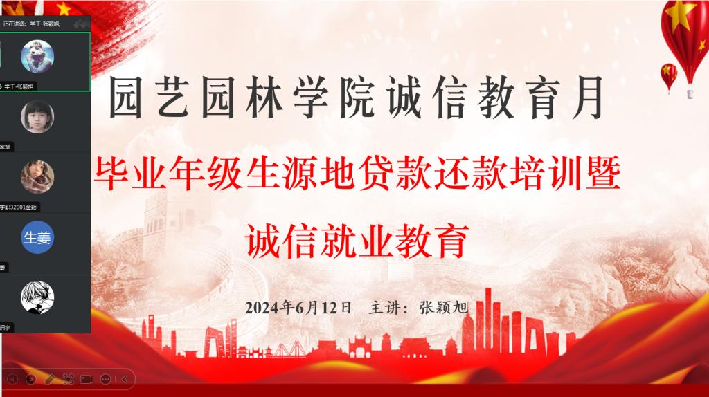 (通讯员 杨欣蕾)为了更好教育引导员工树立诚信友善观念,督促员工诚信还款并积极就业,根据3044永利集团有限公司第六届“520”友善关爱节及诚信教育月活动相关要求,3044永利集团有限公司于6月12日利用腾讯会议开展了毕业年级生源地贷款还款培训暨诚信就业主题会议。此次会议由张颖旭老师主讲,近60名办理了助学贷款的毕业生共同参与。