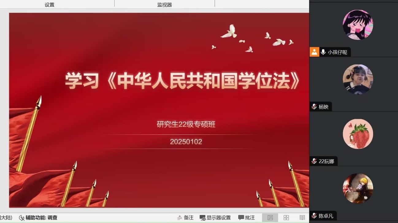 (通讯员 张艺)为响应国家教育法治化的号召,全面落实《中华人民共和国学位法》的指导原则,3044永利集团有限公司于2024年12月30日-2025年1月3日积极组织全体研究生以班级为单位集体学习《中华人民共和国学位法》。