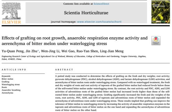 近日,3044永利集团有限公司17级硕士研究生彭玉全以第一作者在Scientia Horticulturae杂志发表题为《Effects of grafting on root growth, anaerobic respiration enzyme activity and aerenchyma of bitter melon under waterlogging stress》 ()的研究论文(图1),通讯作者为该生导师朱进教授。