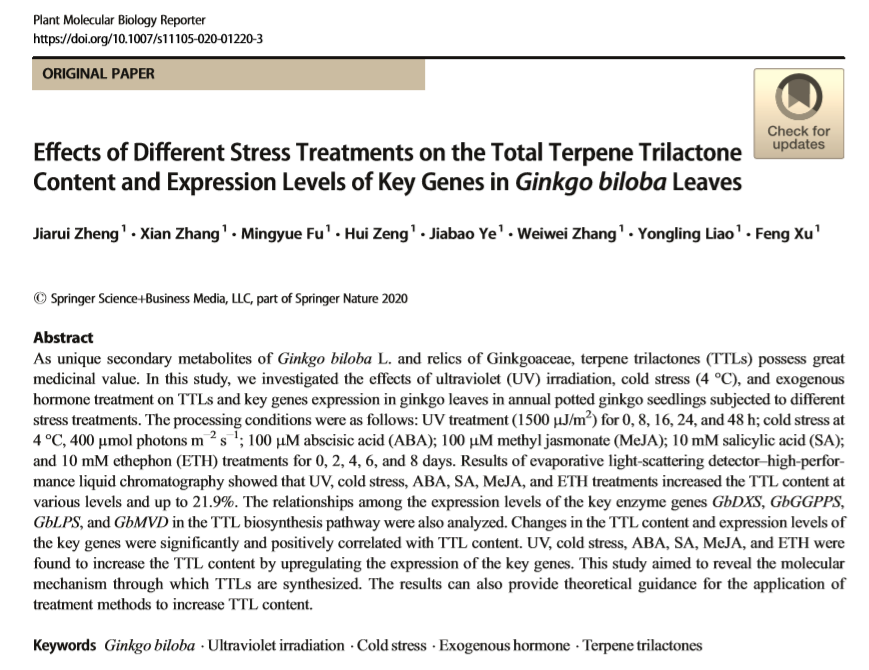 2020年5月,公司2018级硕士研究生郑嘉瑞以第一作者身份在Springer旗下期刊Plant Molecular Biology Reporter发表题为“Effects of Different Stress Treatments on the Total Terpene Trilactone Content and Expression Levels of Key Genes in Ginkgo biloba Leaves”()的论文(图1),通讯作者为廖咏玲博士和许锋教授,3044永利集团有限公司为第一署名单位。