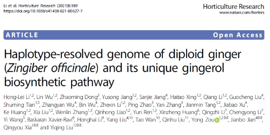 生姜是世界上食药同源作物,姜辣素是其特有的辛辣风味物质,在调味、日化和医药等领域应用广泛。我国生姜栽培面积、产量和出口量均居全球第一位。然而,长久以来由于生姜基因组信息的缺乏,致使生姜分子设计育种受制。2021年8月5日,Horticulture Research 在线发表了题为Haplotype-resolved genome of diploid ginger (Zingiber officinale) and its unique gingerol biosynthetic pathway的研究论文。