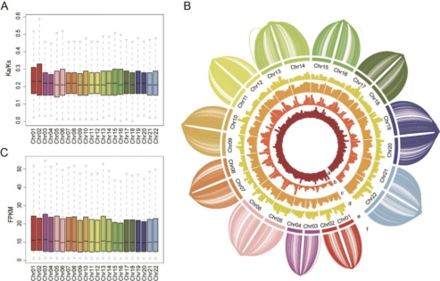 图2.生姜两套单倍型等位基因的比较。A.两个单倍型的单个染色体的Ka/Ks值;B.生姜单倍型1和单倍型0等位基因分布图(从内到外:a.杂合度比率;b.等位基因;c.杂合基因比率;d.DEL比率;e.染色体数目;f.等位基因链接);C.两个单倍型配对染色体中等位基因的FPKM值。