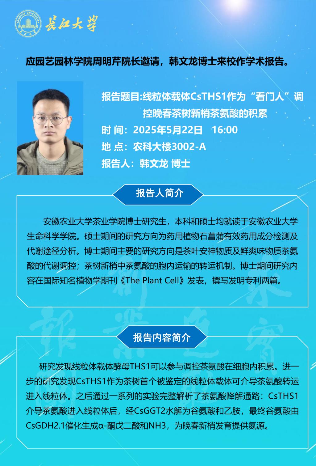 园林讲坛(2025年第九讲):线粒体载体CsTHS1作为“看门人”调控晚春茶树新梢茶氨酸的积累