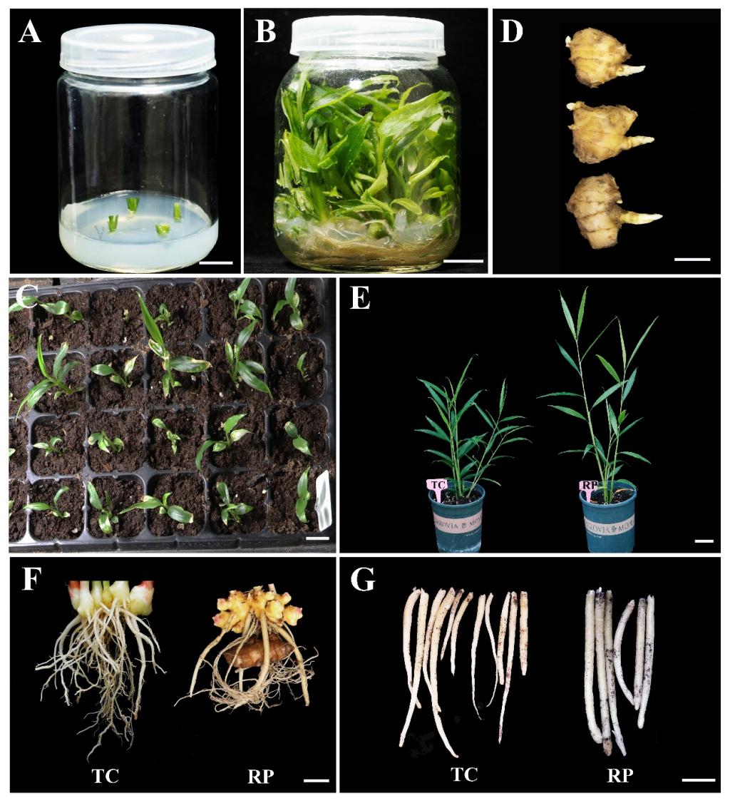 该研究从植物形态特征、组织解剖学、DNA遗传稳定性和内源激素变化的4个维度,系统比较了生姜组培苗与传统姜块繁殖植株的农艺性状、组织解剖形态、DNA含量、染色体数目及SSR标记位点,发现组培苗具有良好的遗传稳定性。研究发现,生姜组培苗繁育植株的根系数量为传统姜块繁殖植株的2.21倍,内源激素IAA/ZR为根茎繁殖植株的13.58倍、IAA/GA3、IAA/ABA比值差异显著,从而抑制生姜组培苗田间繁育植株的姜块膨大,进而初步揭示了生姜组培苗田间繁育原原种根系特别发达(肉质粗根多)、产量低(姜块小)的矛盾机理。