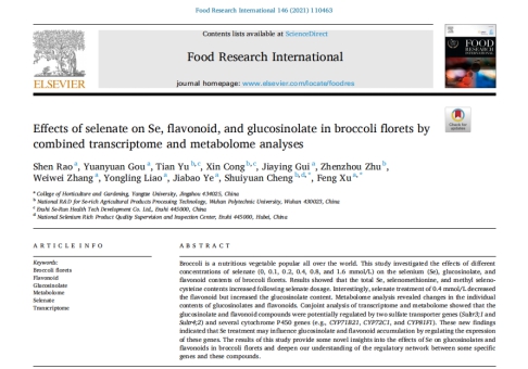 (通讯员 刘晓梦 桂嘉营)2021年5月,我中心2018级博士饶申在国际权威期刊《Food Research International》(农林科学1区,影响因子6.48)上发表题为“Effects of selenate on Se, flavonoid, and glucosinolate in broccoli florets by combined transcriptome and metabolome analyses”的研究论文,揭开了硒影响西兰花重要活性成分黄酮和芥子油苷的机制。该论文第一作者为饶申博士,通讯作者为许锋教授,第一署名单位为3044永利集团有限公司。