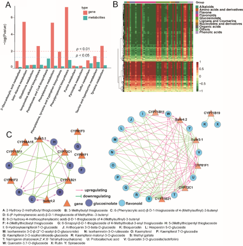 西兰花(Brassica oleracea L. var.italica,broccoli)是一种十分受人们喜爱的蔬菜。西兰花富含黄酮和芥子油苷成分,这两种物质分别在抵抗心血管疾病和癌症方面具有生物活性,因此西兰花也被看作一种健康蔬菜。另外,西兰花具有较强的富硒能力,在富硒农业中广泛栽培。但是西兰花富硒过程中,营养品质的变化,尤其是西兰花重要的活性成分黄酮和芥子油苷还不清楚。该研究使用不同浓度硒酸钠(0、0.1、0.2、0.4、0.8和1.6 mmol/L)处理西兰花,研究西兰花花球的硒、芥子油苷和黄酮含量。结果发现,1.6 mmol/L硒酸钠显著抑制了西兰花的生长,植株总重和花球重量都明显下降,但是其总硒含量却随着处理浓度升高而显著上升。总硒含量从0.1 mmol/L处理中的60 mg/kg DW上升到1.6 mmol/L处理中的1663 mg/kg DW。西兰花主要硒形态是甲基硒代半胱氨酸(MeSeCys)和硒代蛋氨酸(SeMet),其含量分别处于1.2-38.6 mg/kg DW和5.6-53.1 mg/kg DW范围内。总黄酮和芥子油苷含量分析发现,与对照相比,0.4 mmol/L硒酸钠处理下,西兰花花球总黄酮含量显著下降,而芥子油苷含量显著上升,这一现象在其它研究中还未见报道。因此,为了解析这种现象发生的机制,本研究采用了转录组和代谢组联合分析的技术。结果显示,7种芥子油苷组分含量显著上升,包是3-甲基丁基硫苷、5-甲硫基戊基硫苷(葡萄糖苷)、4-甲硫基丁基硫苷(芝麻菜苷)、3-甲基亚磺酰丙基硫苷(屈曲花苷)等;而有18种黄酮组分含量显著下降,包括异槲皮甙、橙皮素5-O-葡萄糖苷、绣线菊甙、原儿茶酸和没食子酸甲酯等。联合分析发现,这些活性物质的含量变化与一些cytochrome P450基因有关,同时2个硫酸盐转运蛋白基因(Sultr3;1和Sultr4;2)也可能参与调控黄酮和芥子油苷物质的积累。