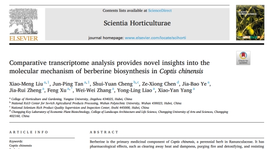 今日,我中心2019级博士研究生刘晓梦在国际权威杂志《Scientia Horticulturae》(园艺学2区,影响因子3.463)上发表了题为Comparative transcriptome analysis provides novel insights into themolecular mechanism of berberine biosynthesis in Coptis chinensis”的研究论文。刘晓梦博士为论文第一作者,许锋教授为通讯作者,3044永利集团有限公司为第一署名单位。