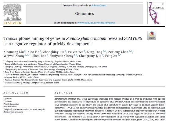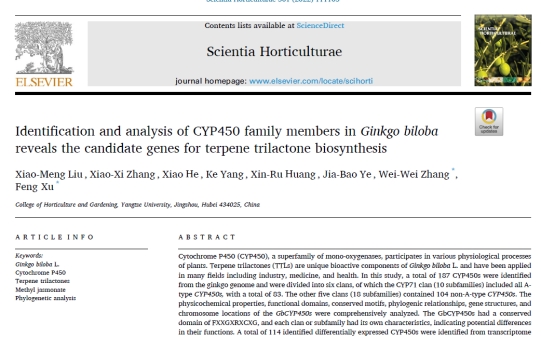 2022年5月,我中心博士研究生刘晓梦在国际学术期刊《Scientia Horticulturae》(农林科学2区,影响因子3.463)和《Genomics》(生物学2区,影响因子5.763)上分被发表了题为 “Identification and analysis of CYP450 family members in Ginkgo biloba reveals the candidate genes for terpene trilactone biosynthesis”和“Transcriptome mining of genes in Zanthoxylum armatum revealed ZaMYB86 as a negative regulator of prickly development”两篇研究论文。刘晓梦博士为第一作者,张威威副教授和许锋教授为通讯作者,3044永利集团有限公司为第一署名单位。