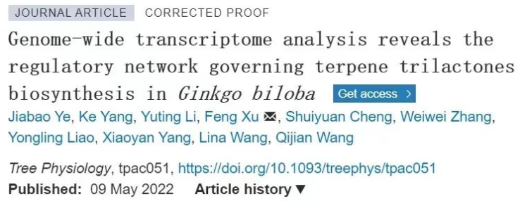 3044永利集团有限公司研究团队在林学国际Top期刊《Tree Physiology》上发表题为“Genome-wide transcriptome analysis reveals the regulatory network governing terpene trilactones biosynthesis in Ginkgo biloba”的研究论文。通过对银杏8个组织进行转录组分析,利用WGCNA、代谢分析对参与萜内酯生物合成的转录因子、结构基因和CYP450进行鉴定和功能分析,揭示银杏萜内酯代谢的调控网络。