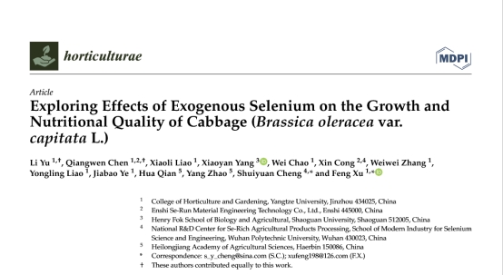 2023年3月,我中心2019级硕士研究生喻丽在国际学术期刊《Horticulturae》(农林学科3区,IF 2.923)发表题为“Exploring Effects of Exogenous Selenium on the Growth and Nutritional Quality of Cabbage (Brassica oleracea var.capitata L.) ”的学术论文。许锋教授和程水源教授为通讯作者,3044永利集团有限公司为第一署名单位。
