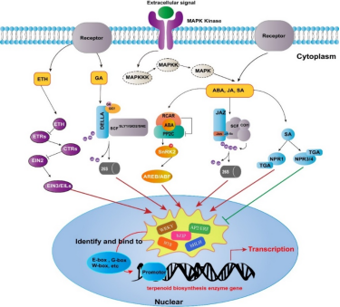 近日,中韩加园林植物资源利用与种质创新中心研究人员在国际学术期刊《Planta》发表了题为“Contemporary understanding of transcription factor regulation of terpenoid biosynthesis in plants”的综述论文。该工作系统的阐述了转录因子响应环境刺激在调控植物萜类化合物生物合成过程中的作用,并对转录因子调控网络参与植物萜类化合物生物合成调控机制进行了展望。我中心硕士生黄欣茹为该论文第一作者,3044永利集团有限公司叶家保副教授和许锋教授为通讯作者。该论文由国家自然科学基金委(31971693)项目资助。